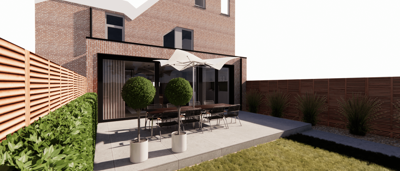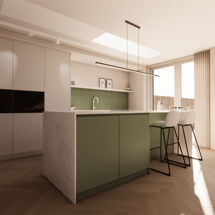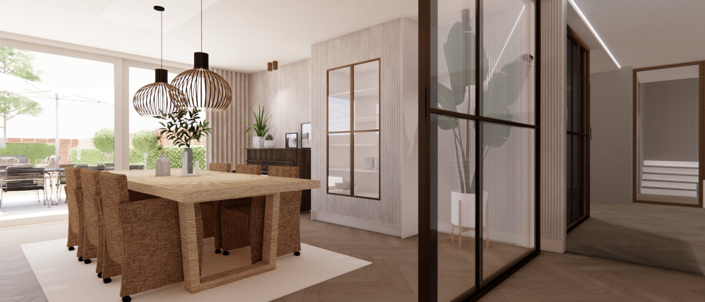 Deze tussenwoning in bodegraven krijgt een uitbouw en interne verbouwing. Er is een nieuwe keuken en maatwerkkasten ontworpen die volledig aansluiten op het interieurontwerp.